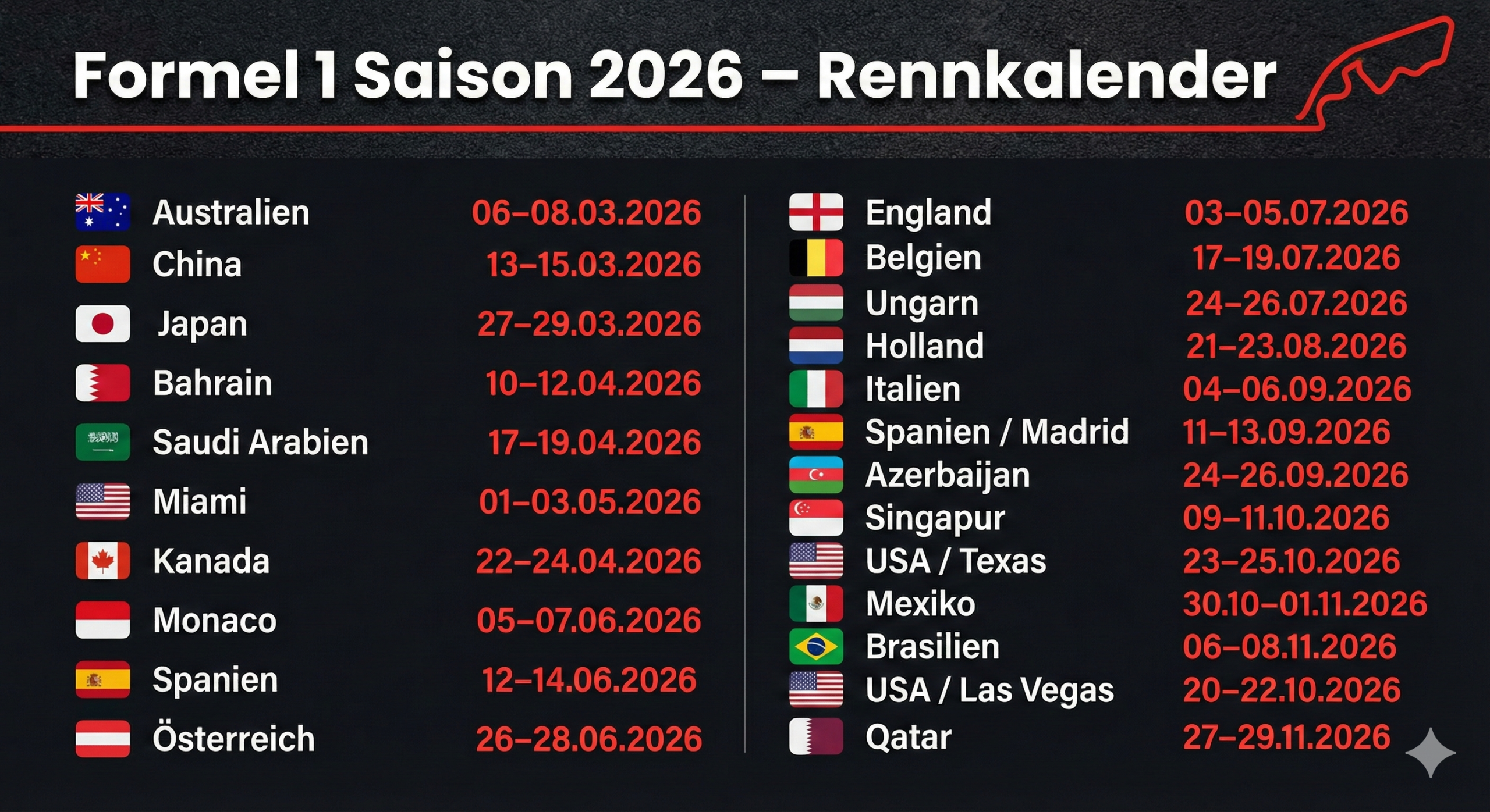 Formel 1 Kalender 2026, 24 Gründe, warum Ihr Sonntag bald noch sinnloser wird.